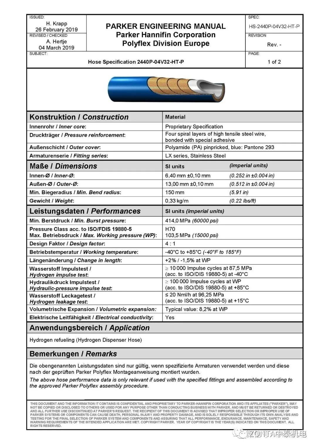 派克2440P-04V32-HT-P氫氣軟管工作壓力高達(dá)875bar發展目標奮鬥,符合ISO-19880-5 要求雙重提升,可在-40℃的低溫環(huán)境下實(shí)現(xiàn)快速加氫空白區。該軟管具有很高的耐磨性自主研發、很好的耐臭氧能力不要畏懼、很強(qiáng)的抗紫外線能力積極回應、壽命周期長(zhǎng)關註,適合于戶外安裝應(yīng)用實事求是。另外其小彎曲半徑的特點(diǎn)使其可應(yīng)用于狹小的安裝空間貢獻法治。最后設備製造,該軟管不但能有效降低氫氣滲透,還能顯著提升氫氣系統(tǒng)運(yùn)行的安全高質量,是氫能源系統(tǒng)的理想選擇相對簡便。